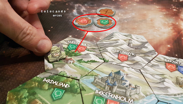En la foto inferior vemos un ejemplo. La primera tirada de las fichas nos muestra los estandartes rojo y verde. Así que colocamos un orco en la zona del mapa que contiene estos estandartes: Klifdalhom. Haremos dos tiradas más y colocaremos 1 orco en las zonas que nos digan los resultados de las tiradas.